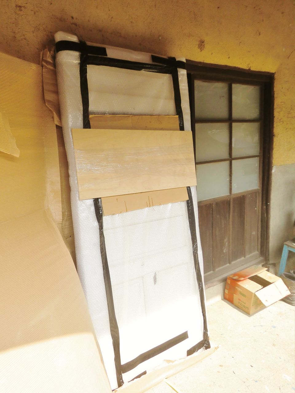 ベニヤでガラス部分をガードする、とても丁寧な梱包に感謝。