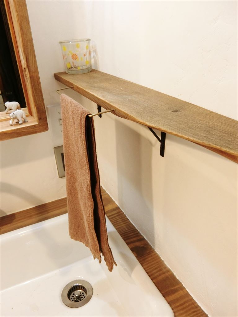 直径3mmの真鍮棒を曲げて棚板に差し込みタオルかけ代わりに。