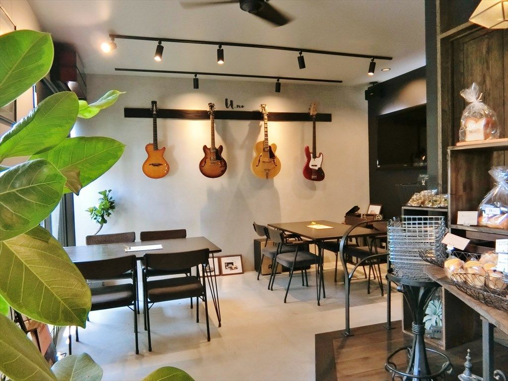入って左はテーブル席が二つで、壁にギターが4つ飾ってある。