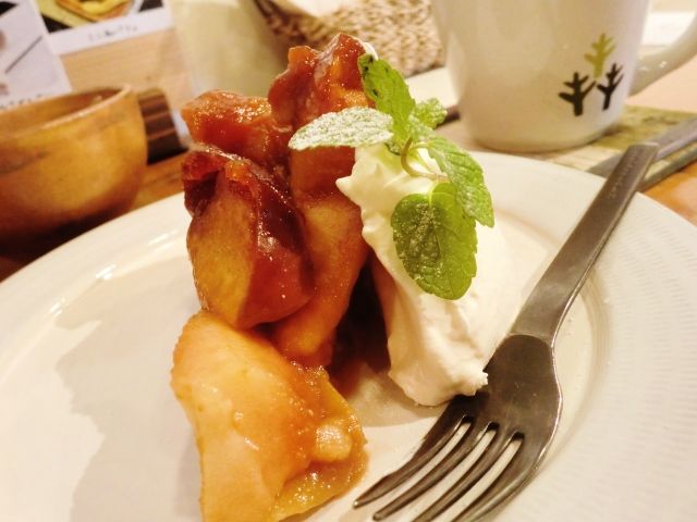 リンゴの煮たやつがほろ苦くて、クリームと一緒に食べるとちょうどよかったです。