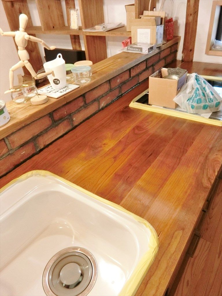 さくらの天板のキッチンをオイルを塗布して仕上げマス。